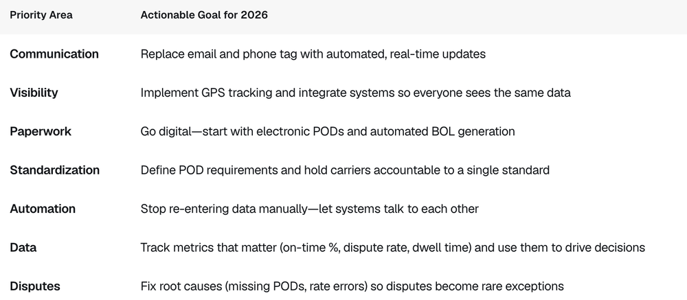 If you answered "no" or "not sure" to any of the seven questions above, you've identified your priorities for building a modern freight strategy in 2026. Here's your roadmap: