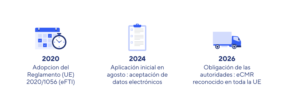 Obliga a las autoridades europeas a aceptar la información electrónica, incluido el eCMR, a partir de agosto de 2024, con una implantación generalizada prevista para 2026.