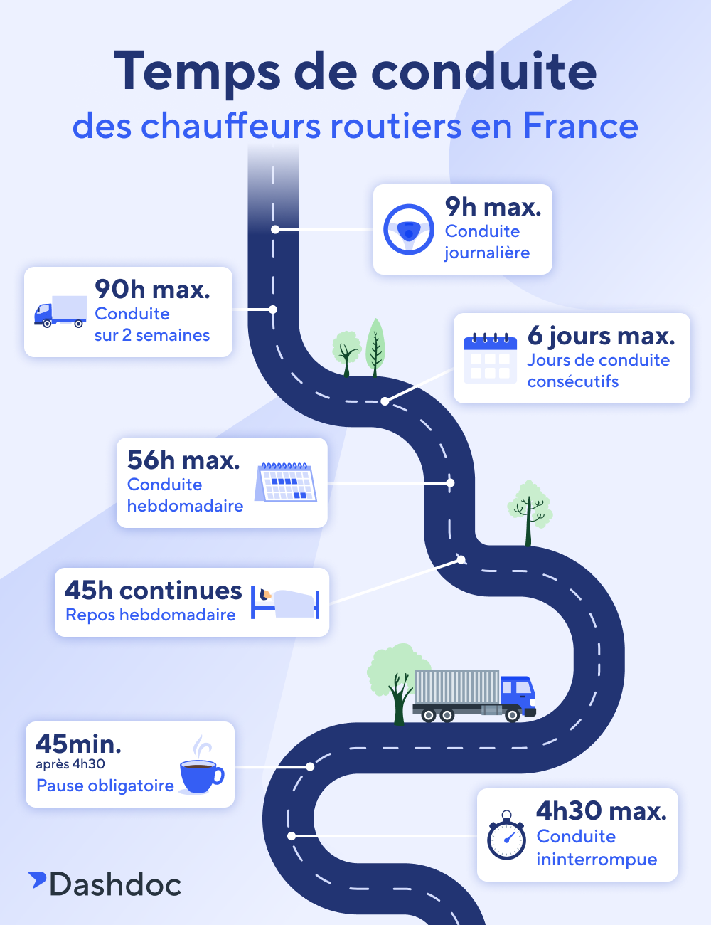 Après 4 h 30 de conduite continue, une pause de 45 minutes (en une fois ou fractionnée en 15 min + 30 min) devient obligatoire. Les heures de repos journaliers minimum sont de 11 heures consécutives (réductibles à 9 heures trois fois par semaine), et le temps de repos hebdomadaire doit atteindre au moins 45 heures (réduit à 24 h une fois toutes les deux semaines, avec compensation).